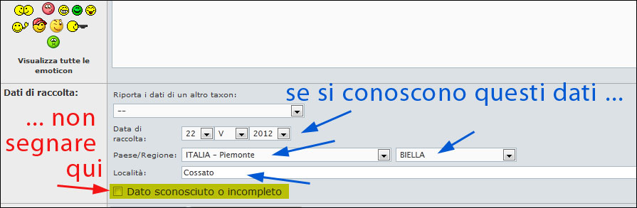 Ho inserito io i dati di raccolta :) e dato che ci sono tutti, i dati intendo, anche più di quelli strettamente richiesti come ad esempio descrizione della vegetazione, altezze sul livello del mare, ecc. non si deve inserire il segno di spunta nel campo "Dato sconosciuto o incompleto".