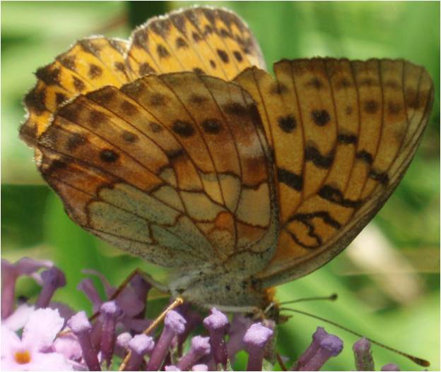 di nuovo buongiorno a tutti, oggi a mezzogiorno ho fotografato questa farfalla nel mio giardino, era sulla mia buddleia. sono sicura che si tratta di un brenthis, ma quale? ino o daphne? io avrei optato per daphne ma leggendo qua e là ... non dovrebbe essere più violaceo sul lato inferiore? mi potete aiutare per favore e magari anche spiegare da cosa si capisce che uno piuttosto che l'altro. io guardo sempre le immagini nei database ma non ci capisco mai niente lo stesso. santa ignoranza! e vorrei tanto capire....