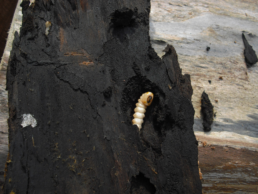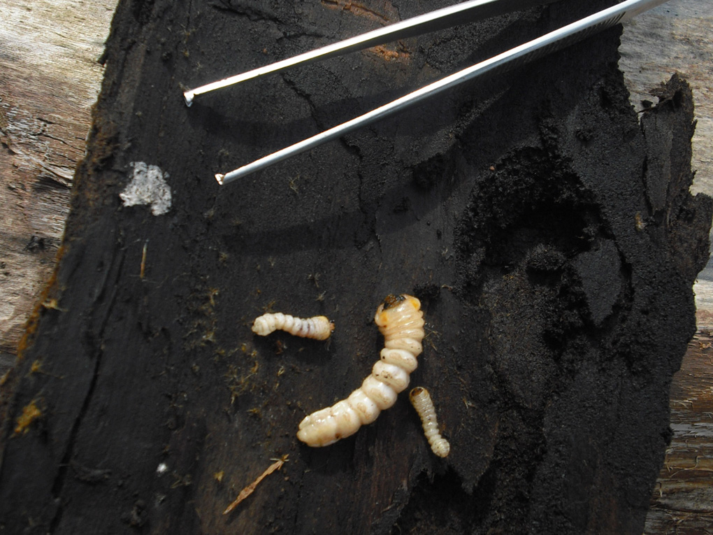 Sotto la prima striscia subito due tipiche larve di cerambicide , immerse nella loro rosura nero inchiostro