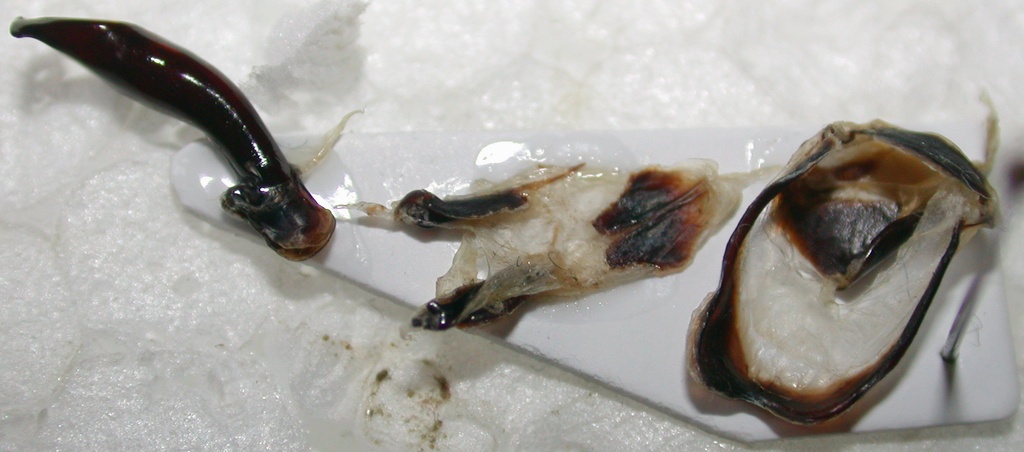 Torno sull'argomento genitali... Poco fa stavo provando senza successo a scannerizzare l'unico isteride che ho preparato (a parte due Hister sp.) ed estratto  , quello cui accennavo all'inizio di questa discussione. Dato che non riesco ad ottenere immagini decenti, e dunque non riesco ad aprire una richiesta di determinazione, ne approfitto per vedere almeno se sono riuscito ad identificare bene le suddette parti anatomiche. Intanto una visione d'insieme, così il nostro isteridologo di fiducia potrà dirmi se la preparazione fatta così va bene o se devo correggere qualcosa (se mai ritenterò l'impresa  ): Qui il dettaglio (sfocatissimo) dei genitali: Le mie ipotesi sono: 1: non si vede nulla nell'immagine, comunque sono un'asticina rigida parzialmente inserita in un'altra parte allungata... Quindi immagino siano l'edeago e lo spiculum, che non sono riuscito a separare; 2: 8° urosterno; 3: 9° e 10° urosterno. ... C'ho preso?