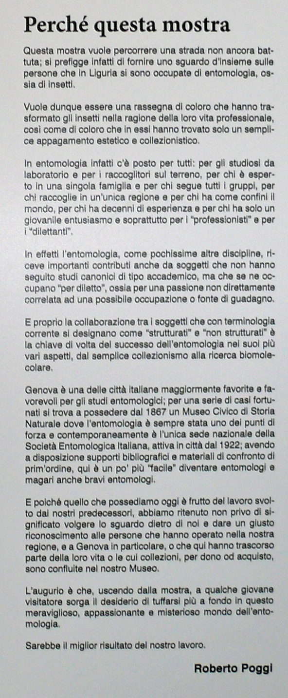 A questa ottima sintesi di Maurizio, permettetemi di aggiungere quanto ha scritto l'amico Robero Poggi, nel primo poster di presentazione della mostra "Entomologia in Liguria - Storie di insetti, uomini e collezioni", mostra che invito chiunque abbia a cuore la nostra comune passione di andare a visitare se di passaggio a Genova, perché, in quella storie apparentemente lontane, c'è anche un pezzo della nostra storia e Roberto è riuscito, come pochi, a trasmetterne totalmente l'essenza :)