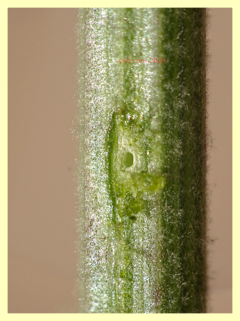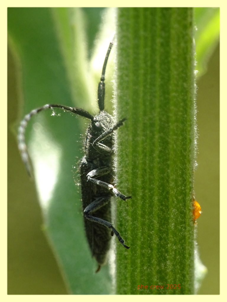 Dunque sono arrivato a conclusione che queste Agapanthia sp. sfruttano e si cibano di larve o uova di qualche parassita di Asteraceae. Cercano la secrezione arancio sui gambi, la debellano con le fauci....ovviamente la pianta di nuovo ferita secerne liquido bianco e prima che si secchi si pappano cio' che c'e' sotto lasciando intravvedere il foro della larva (nella prima foto postata in questo post). Le scalanature fatte con le fauci si vedono bene intorno alla goccia bianca.