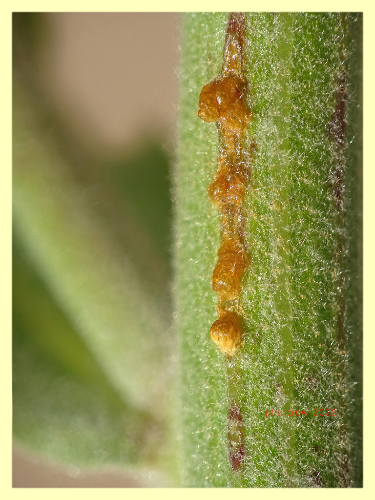 ...che mi ricorda subito un mio vecchio post. So che le Asteraceae quando gli viene inferta una ferita fanno fuoriuscire un liquido inizialmente di color chiaro che poi seccandosi diventa rossiccio - bruno o giu di li. Il post cui mi riferisco e' quello con le Stilbula sp. dove con le loro punture fanno secernere al probabile Tarassaco una sostanza liquida che poi inscuri formando tante piccole gocce sparse per il gambo e i boccioli.