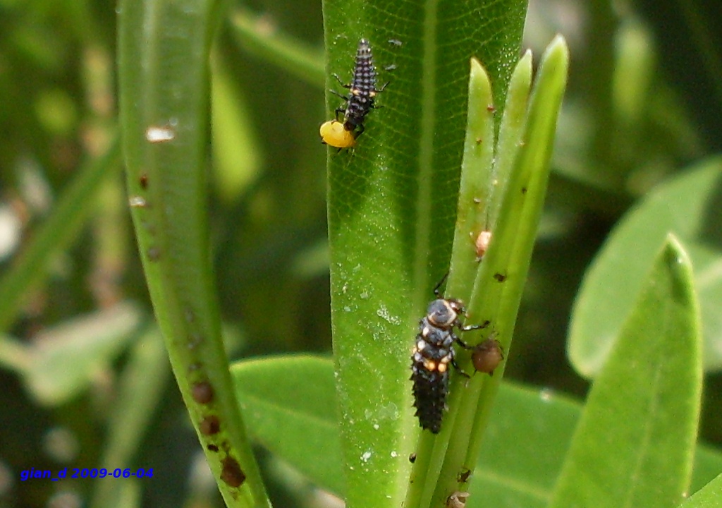 E qui due larvette di Coccinella 7-puntata. Una beccata con il "boccone" in bocca