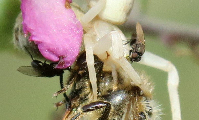 CURIOSITA': mentre una ragno morde la preda almeno 7 piccole mosche zampettano sulla vittima e sul predatore (mi sembra una femmina di misumena vatia). Mi domandavo queste piccole mosche di che specie sono e se è una stranezza questa situazione.