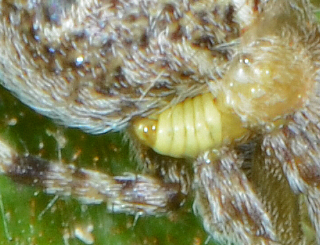 questa Neoscona subfusca ha una piccola larva attaccata all'addome. Il ragno non era certo paralizzato, si muoveva velocemente; in ogni caso i ragni paralizzati da imenotteri vengono portati nel nido, non mi risultano imenotteri che depositano l'uovo sul ragno senza paralizzarlo. Per questo ho pensato a un dittero, ma non ne sono sicuro. Qualcuno ha idea di che parassita si tratti? anche solo a livello di famiglia.