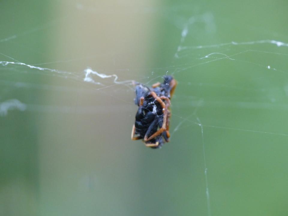 Chalybion ha scritto: certo che la madre di quel parassita rischia alquanto per deporre uova su ragni appostati in una ragnatela!  Credo che il rischio ci sia. Questi resti su una ragnatela di Argiope bruennichi hanno tutta l'aria di appartenere ad un Batozonellus lacerticida maldestro.