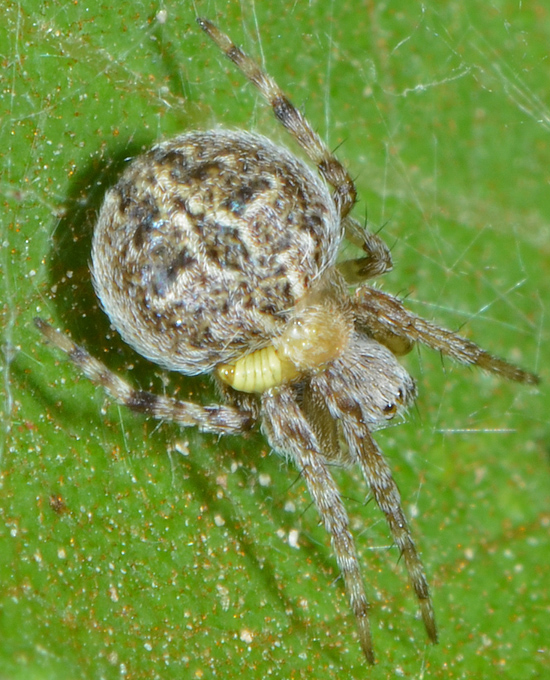 questa Neoscona subfusca ha una piccola larva attaccata all'addome. Il ragno non era certo paralizzato, si muoveva velocemente; in ogni caso i ragni paralizzati da imenotteri vengono portati nel nido, non mi risultano imenotteri che depositano l'uovo sul ragno senza paralizzarlo. Per questo ho pensato a un dittero, ma non ne sono sicuro. Qualcuno ha idea di che parassita si tratti? anche solo a livello di famiglia.