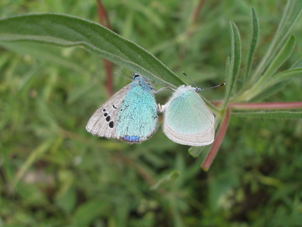 Stavo cercando di fotografare in posizione consona l’accoppiamento di questi Licenidi, quando altri due individui (maschi suppongo) hanno cominciato a disturbare la coppia incuranti della mia presenza e dei miei tentativi di allontanarli e di spostare lo stelo in modo da avere la visuale libera. I tentativi dei due importuni sono continuati per lungo tempo, finché, dopo aver potuto fare una foto ragionevole, non me ne sono andato.