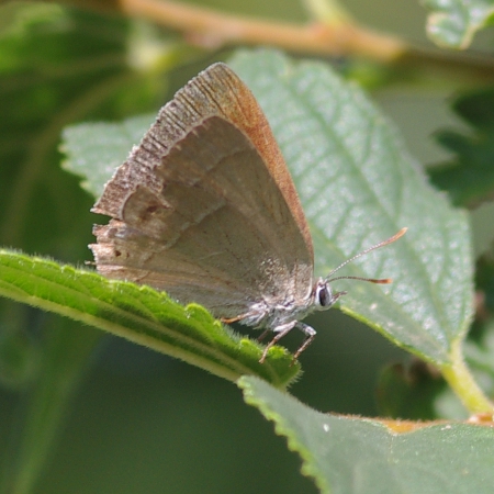 Secondo il mio libro 'Collins' - ci sono due di queste Lycaenid 'hairstreak' qui intorno a settembre. Quercusia quercus, cioe abbastanza blu, e questa e castagna/marrone, quindi propongo Thecla betulae. Il mio dubbio e che i colori di betulae sul rovescio mi sembrono piu 'vivace'.