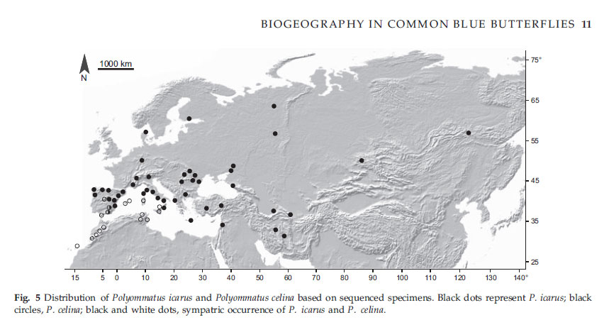 Non è possibile darne conferma dall'osservazione di questa sola foto ma anch'io penso possa trattarsi non di icarus ma della specie che la sostituisce in Sicilia, Polyommatus celina (Austaut, 1879) (cf.). Alcuni recenti studi morfo-genetici hanno dimostrato che quella che si riteneva una sottospecie della Polyommatus icarus è invece una buona specie Polyommatus celina (Austaut, 1879) e che questa specie che si riteneva relegata in Nord Africa è invece presente anche sul nostro territorio, confinata in Sicilia e Sardegna dove va a sostituire la Polyommatus (Polyommatus) icarus (Rottemburg, 1775). Secondo i dati, i campioni provenienti dalla Sicilia sono P. Celina, mentre i campioni della vicina Calabria, separate dallo stretto di Messina, sono P. icarus. Lo stesso si verifica quando si confrontano esemplari provenienti dalla Sardegna che risultano essere P. celina con quelli della vicina Corsica che sono invece P. icarus. Nonostante la vicinanza geografica tra le due specie in queste aree, non si è trovato alcuna prova di ibridazione. Cambiano dunque le attribuzioni sino ad ora date alle popolazioni di icarus sardo-corse che devono essere assegnate non più a Polyommatus (Polyommatus) icarus (Rottemburg, 1775) ma a Polyommatus (Polyommatus) celina (Austaut, 1879). Distribuzione più generale della Polyommatus (Polyommatus) celina (Austaut, 1879) E' presente nelle isole Canarie, Sicilia, Sardegna e le Baleari dove sostituisce completamente P. icarus. Solo in alcune zone della Penisla Iberica, si possono trovare entrambe le specie. Documentazione: A combined genetic-morphometric analysis unravels the complex biogeographical history of Polyommatus icarus and Polyommatus celina Common Blue butterflies. Supporting information - A combined genetic-morphometric analysis unravels the complex biogeographic history of Polyommatus icarus and P. celina Common Blue butterflies. |