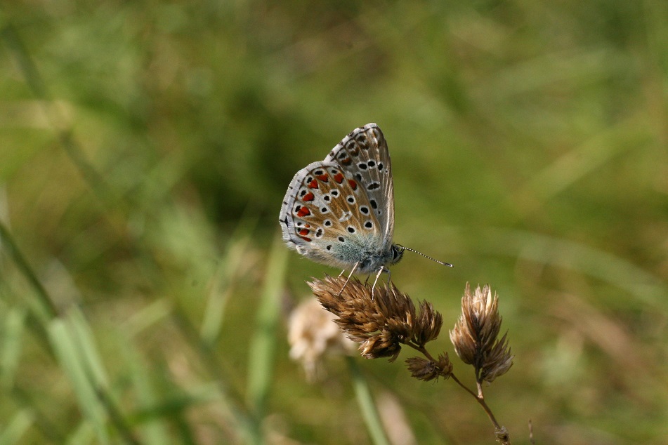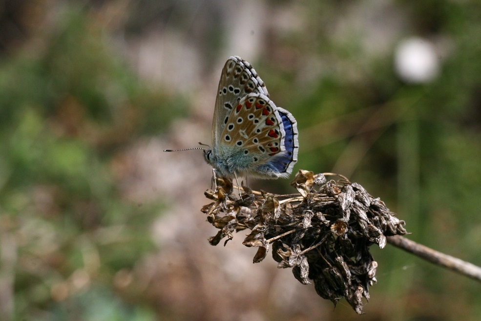 Ho fotografato questo Lycaenidae attratto dall'insolita brillantezza del colore della pagina superiore delle ali, pensando che non si trattasse dell'a me già noto Polyommatus icarus... Ma anche armandomi di occhio da lince e confrontando la pagina inferiore delle ali (l'unica che abbia potuto immortalare) con un'esplicativa immagine sul web che raccoglie assieme le ali dei vari Polyommatus italiani, non riesco a venirne a capo...
