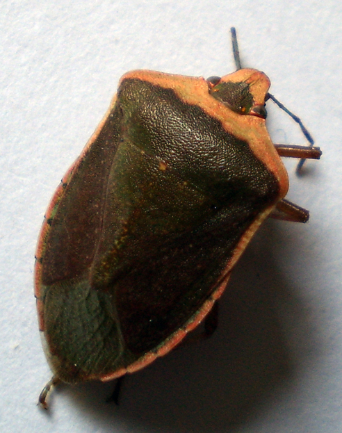 vorrei il vostro aiuto per identificare questo Pentatomidae che ho rinvenuto morto sotto una finestra della mia abitazione (Vinci - FI), ancora fresco. Ad occhio (ovviamente non c'è mai verso di trovare un righello quando serve :twisted:), misura 12 - 14 mm.
