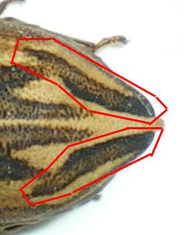 "2.Le due grandi linee che si trovano sullo scutello in posizione caudale si piegano ad angolo divergendo sensibilmente......Odontotarsus robustus..."
