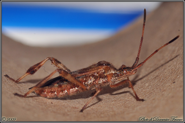 Non poteva mancare, nel nostro forum, uno degli alieni (fra gli insetti) più fotografato in natura negli ultimi tempi, insieme al Licenide Cacyreus marshalli. Mi riferisco al Leptoglossus occidentalis Heidemann 1910, vistoso e magnifico eterottero della famiglia dei Coreidi, originario degli Stati Uniti occidentali (California, Oregon e Nevada) ove trova il suo habitat naturale, costituito dalle foreste di conifere. La specie, giunta in Italia attraverso l'importazione di legname, è stata segnalata per la prima volta nel nostro paese, se non sbaglio, nel 1999 ed è ormai diffusa in tutta la penisola, isole maggiori comprese. Non si può non riconoscerne la straordinaria bellezza della livrea e l' eleganza della forma complessiva, specialmente delle zampe posteriori, ancor meglio apprezzabili nella foto a maggiori dimensioni che allego. L'esemplare è stato raccolto oggi, nel mio giardino (Carini) Cliccando qui si apre la stessa immagine, in grande formato.