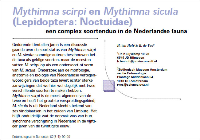 purtroppo non ho materiale in merito :( ma ho trovato in rete un bel documento: Mythimna scirpi en Mythimna sicula (Lepidoptera: Noctuidae) - een complex soortenduo in de Nederlandse fauna - H. ten Holt & R. de Vos - (2002 090-095), da cui cito (perdonate la traduzione :oops: ):