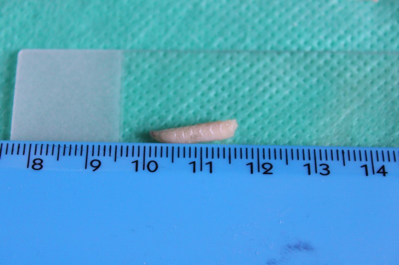 La dimensione è di circa 12 mm. L'apparato buccale sembra essere del III stadio cosi come gli spiracoli.
