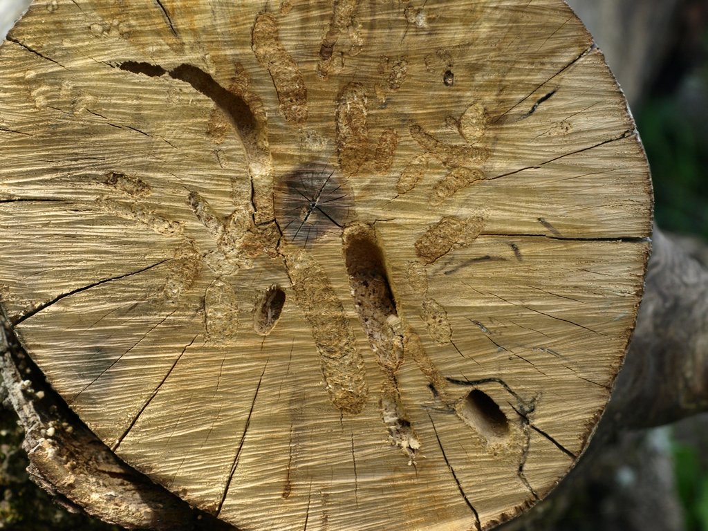 Visto che qui c'è gente che riesce a determinare un Cerambycidae dal foro che lascia, vi chiedo se sapete che cosa può essere a fare questi fori su un grosso acero morto da tempo, e da poco crollato a terra, a Tolfa, Valle di Rio Fiume (RM).