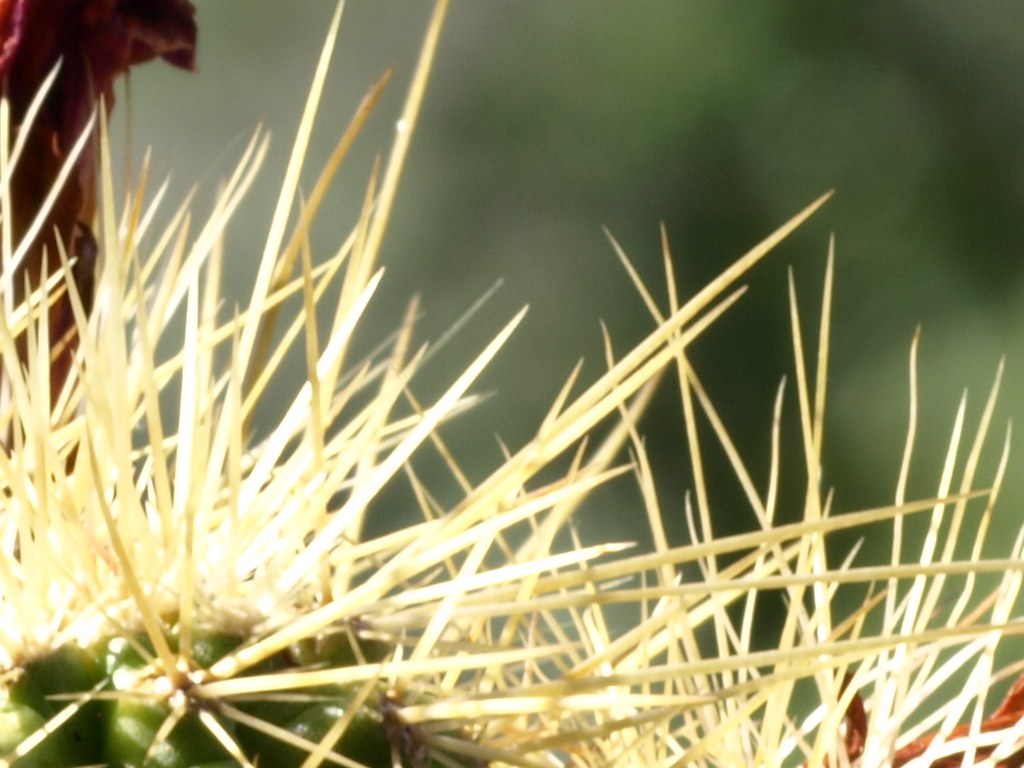 Oggi non era il caso di uscire in campagna a fare foto, causa tempo shifoso. Però ho fatto qualche prova sul balcone sulle piante grasse. Ne ho scelta una piuttosto difficile perchè le spine difficilmente vengono bene a fuoco. Ovviamente ho dovuto usare il flash, per la scarsissima luce a causa del cielo completamente coperto. Sono entrambe fatte con fuoco 22 e 100 ISO, a 1/200 con la D200 e a 1/160 con la E-410 (tempi di sincro-flash), con il Micro Nikkor 55/2.8. Con l'Olympus è più difficile da usare a mano libera, perchè bisogna chiudere manualmente il diaframma e poi scattare (e col diaframma a 22 e poca luce non si vede più niente nel mirino), mentre con la Nikon l'obiettivo funziona normalmente, quindi il diaframma si chiude quando si scatta. L'obiettivo era alla minima distanza di messa a fuoco, corrispondente ad 1:1 sul sensore. La risoluzione delle foto è la stessa, la massima delle due macchine, circa 10 Mpixel, e poi ho fatto un crop di una parte di 1024x768 pixel (scegliendo le due parti venute più a fuoco per entrambe). Per l'illuminazione ho usato il flash anulare Vivitar in manuale. Ho lasciato i dati EXIF sulle due foto.