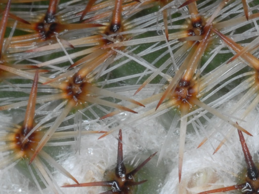 Oggi non era il caso di uscire in campagna a fare foto, causa tempo shifoso. Però ho fatto qualche prova sul balcone sulle piante grasse. Ne ho scelta una piuttosto difficile perchè le spine difficilmente vengono bene a fuoco. Ovviamente ho dovuto usare il flash, per la scarsissima luce a causa del cielo completamente coperto. Sono entrambe fatte con fuoco 22 e 100 ISO, a 1/200 con la D200 e a 1/160 con la E-410 (tempi di sincro-flash), con il Micro Nikkor 55/2.8. Con l'Olympus è più difficile da usare a mano libera, perchè bisogna chiudere manualmente il diaframma e poi scattare (e col diaframma a 22 e poca luce non si vede più niente nel mirino), mentre con la Nikon l'obiettivo funziona normalmente, quindi il diaframma si chiude quando si scatta. L'obiettivo era alla minima distanza di messa a fuoco, corrispondente ad 1:1 sul sensore. La risoluzione delle foto è la stessa, la massima delle due macchine, circa 10 Mpixel, e poi ho fatto un crop di una parte di 1024x768 pixel (scegliendo le due parti venute più a fuoco per entrambe). Per l'illuminazione ho usato il flash anulare Vivitar in manuale. Ho lasciato i dati EXIF sulle due foto.