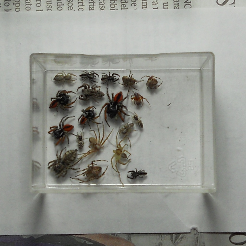 Qualche giorno fa, mi sono imbattuto in alcuni nidi di vespa vasaio che aveva costruito in alcuni scatoloni. Dopo averla cacciata via, ho recuperato i nidi, riuscendo a prelevare un gran numero di ragni, credo paralizzati e quindi ormai morti. Siccome ce ne sono di interessanti e svariati specie, volevo chidervi se riuscivate a riconoscerne qualcuno!