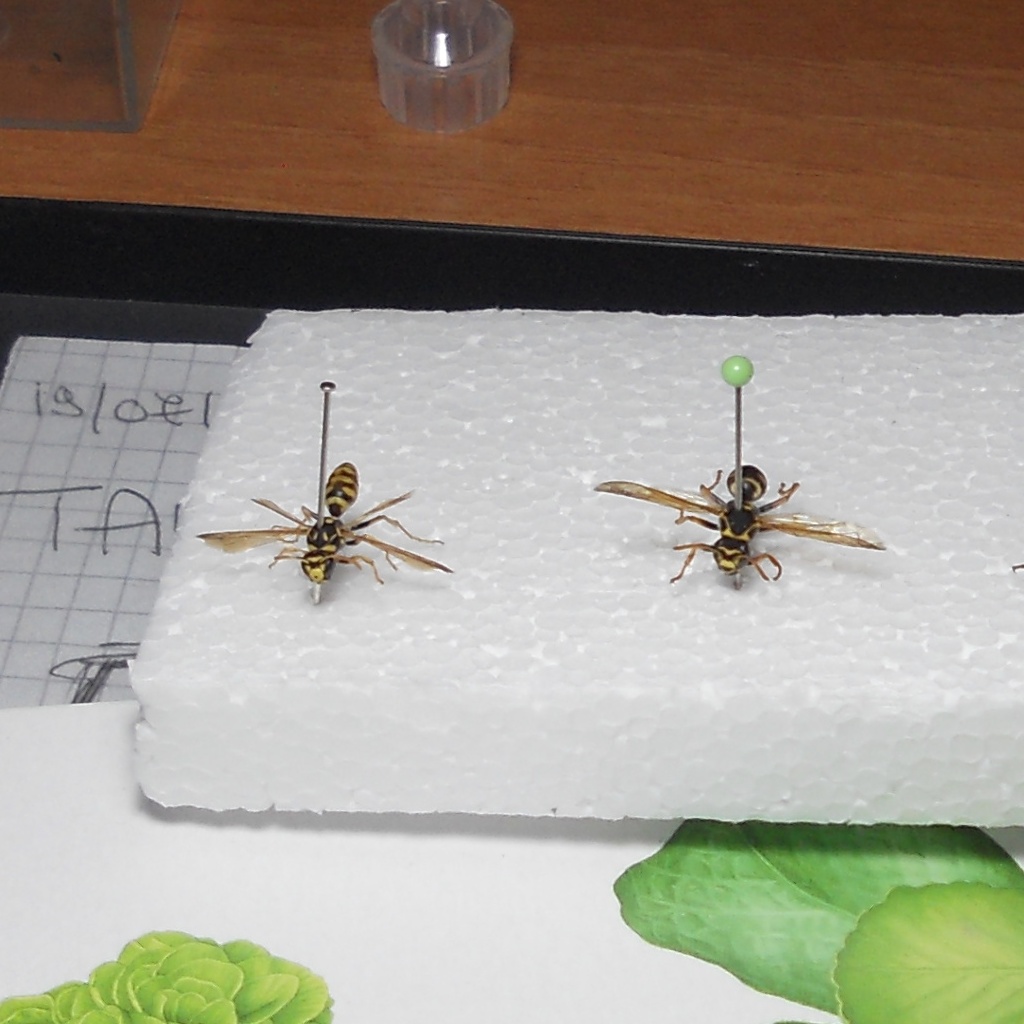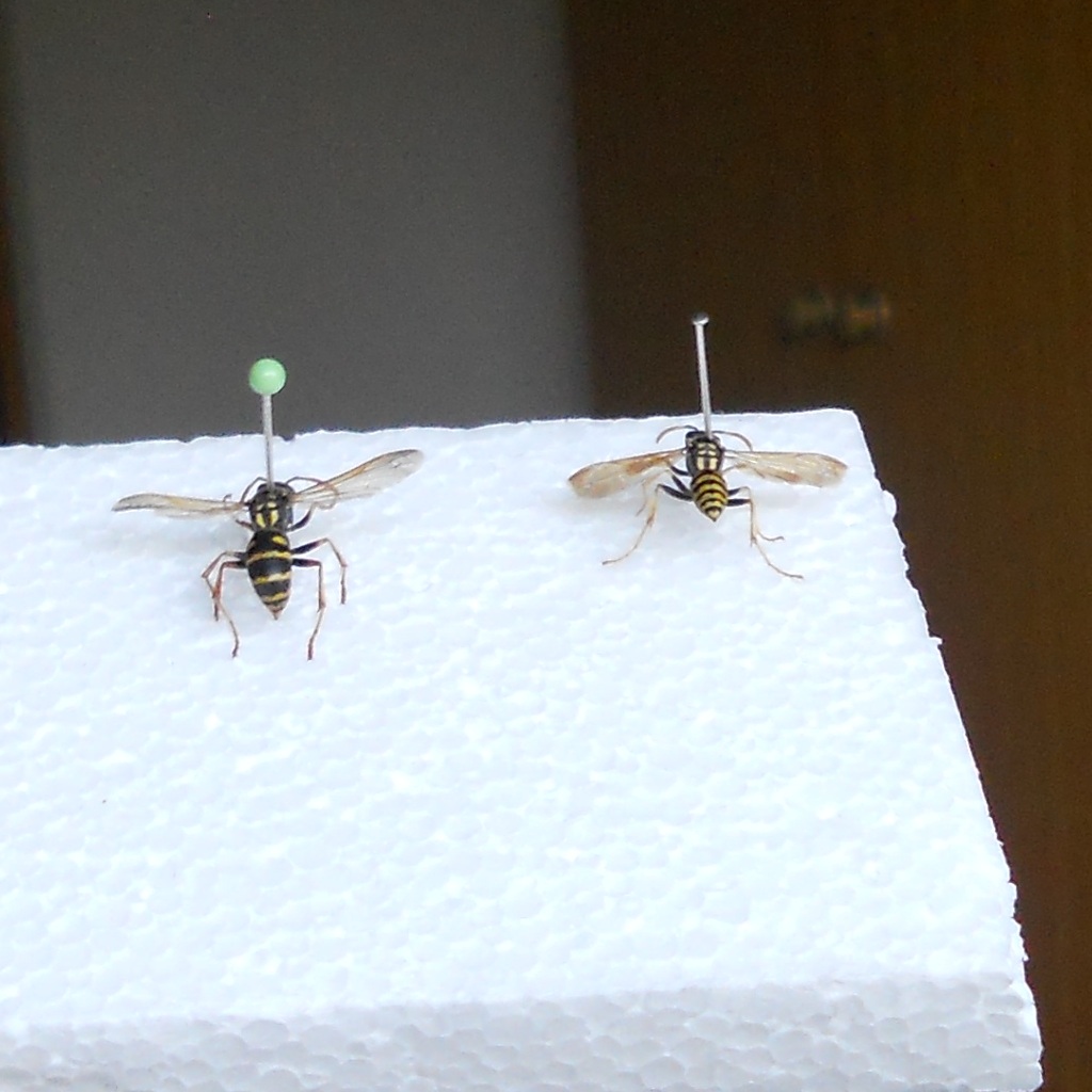 Quella con lo spillo con pallina verde sembrerebbe Polistes dominula per guance gialle e mandibole nere, quell'altra si direbbe Polistes gallicus per guance nere e mandibole gialle.