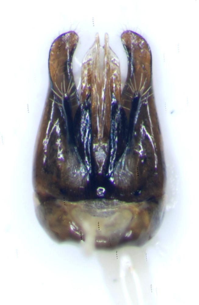 è caratteristica la forma dell'apice delle gonocoxe (nel nobile sono di forma variabile, ma in ogni caso più squadrate), così come la conformazione delle volselle, con la cuspide, cioè il lobo laterale provvisto di setole, leggermente più lungo del digito, il lobo interno appuntito (nel nobile è il contrario)