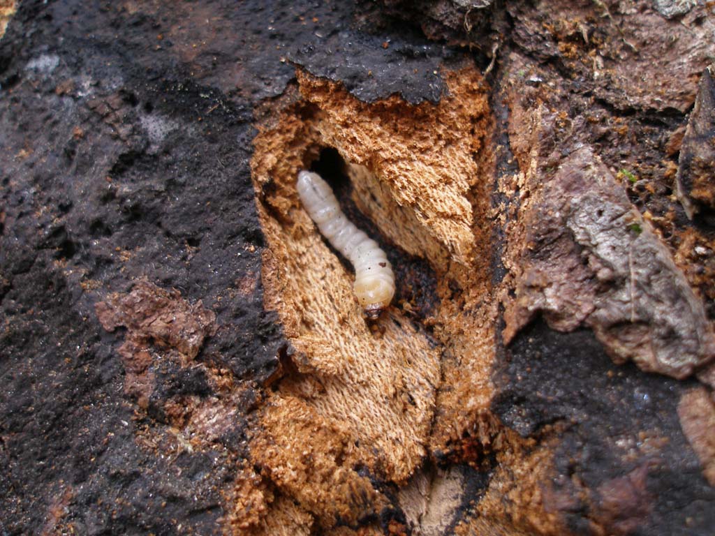Proprio ora o poco più avanti, dipende dall'andamento stagionale. La larva attacca legno morto da (non molto) tempo e spesso, come si vede dalla foto in cui è ripresa la pupa da lontano, in simbiosi con muffe nere. Quando, sotto corteccia, vedi muffe bianche e la corteccia stessa si stacca facilmente, è già troppo tardi. E' evidente che occorre essere in presenza di grossi tronchi di faggio con corteccia abbastanza spessa. Questo Acanthocinus, infatti, si svluppa e si impupa sotto o (addirittura, se la cortecca è molto spessa) dentro la corteccia.