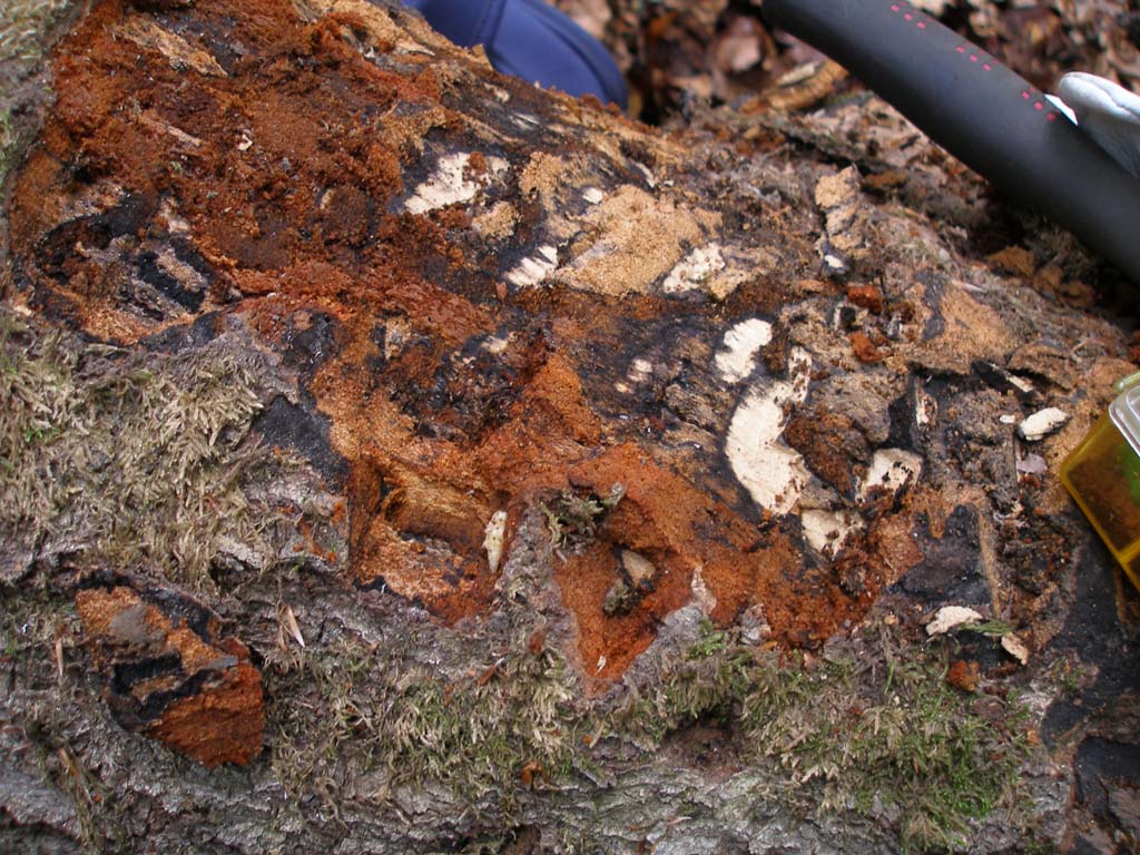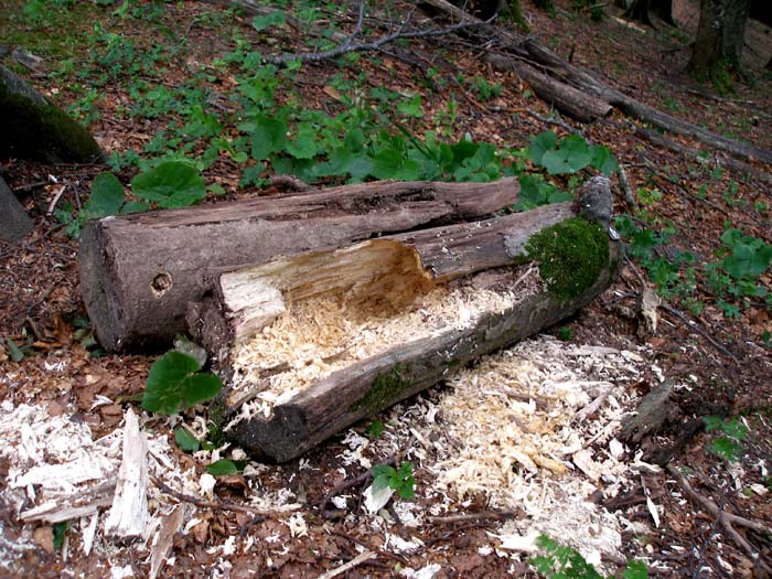Aggiungerei questa foto, presa nello stesso ambiente. Ci siamo imbattuti in tronchetti di Faggio scavati da qualche unghia forte alla ricerca di larve di Coleotteri. In uno, non fotografato, erano ancora presenti larve di Scarabaeoidea, probabilmente Synodendron cylindricum. In questo, scavato fino al cuore, non era rimasto alcunché. La scorpacciata di un mammifero ? una volpe ?