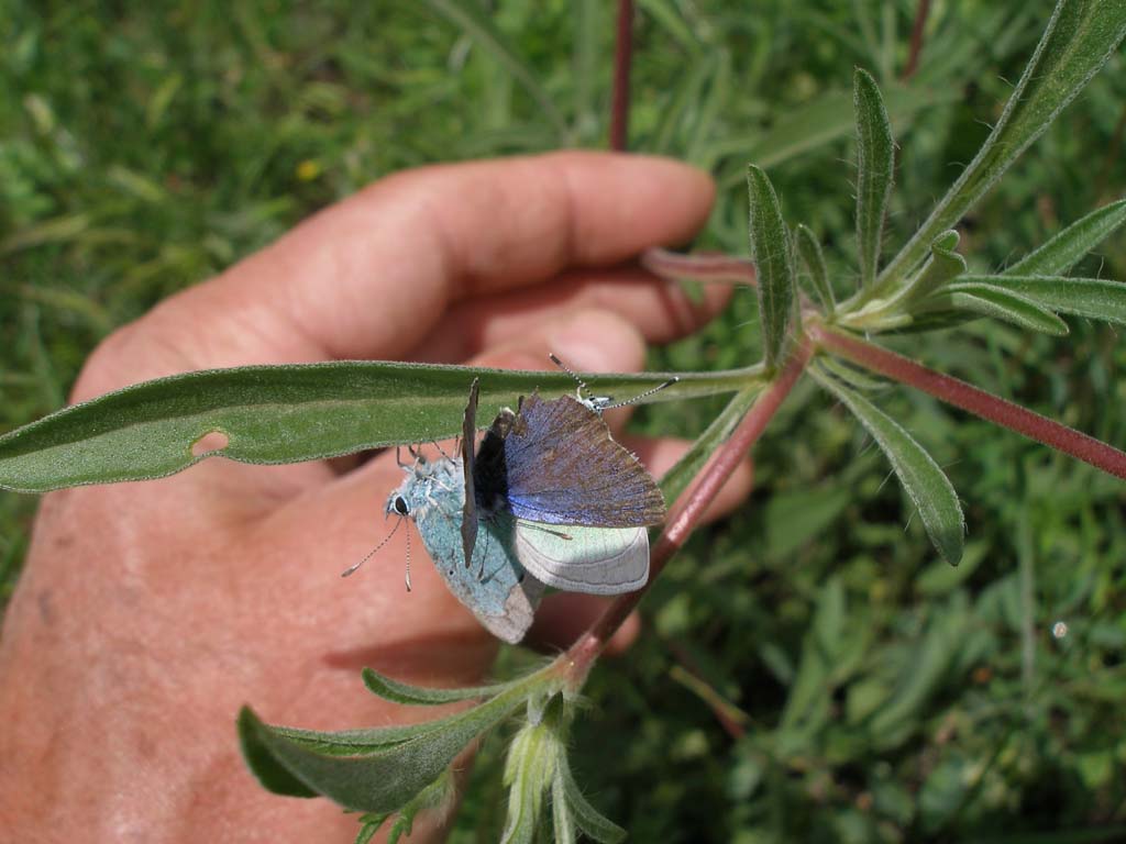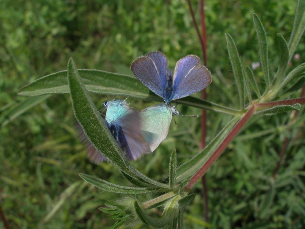 Stavo cercando di fotografare in posizione consona l’accoppiamento di questi Licenidi, quando altri due individui (maschi suppongo) hanno cominciato a disturbare la coppia incuranti della mia presenza e dei miei tentativi di allontanarli e di spostare lo stelo in modo da avere la visuale libera. I tentativi dei due importuni sono continuati per lungo tempo, finché, dopo aver potuto fare una foto ragionevole, non me ne sono andato.