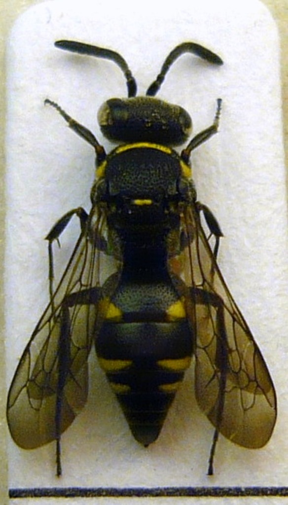 Anche questo, come quello di Forbix qui è un Nysson. Secondo me (ipotesi di lavoro...!) si tratta della femmina di Nysson trimaculatus, che è molto simile al maschio per colorazione e struttura, ma ha anche il torace macchiato di giallo. Bisognerebbe vedere il secondo sternite, che dovrebbe essere angolato ancora più di quello del maschio (ma bisognava spillare l'esemplare...).
