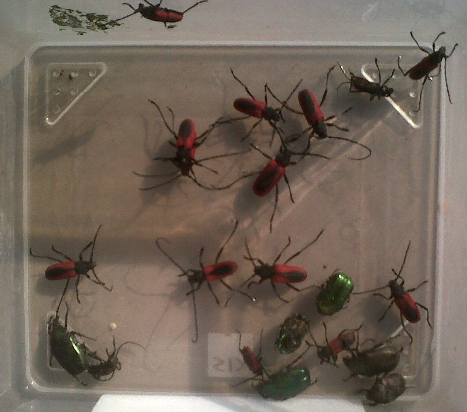 Ritirate ieri sera le trappole: niente Cerambyx eccetto uno scopoliii, ma molti Purpuricenus (v foto, con il contenuto parziale di una sola trappola!) nonchè altre due specie di cerambicidi che porterò quanto prima alla vostra attenzione.