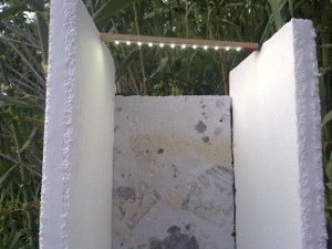 I Pannelli di polistirolo mi sembrano poco indicati. In pratica la luce si vede solo da davanti e questo credo riduca molto l'efficacia. Potresti provare a sostituirli con dei pannelli di plastica traslucida, o bianca ma sottile, che riflettono parte della luce ma risultano luminosi anche dal lato esterno. Alcuni insetti andranno sull'esterno delle pareti, ma comunque verranno attirati e magari prima o poi cadranno dentro.