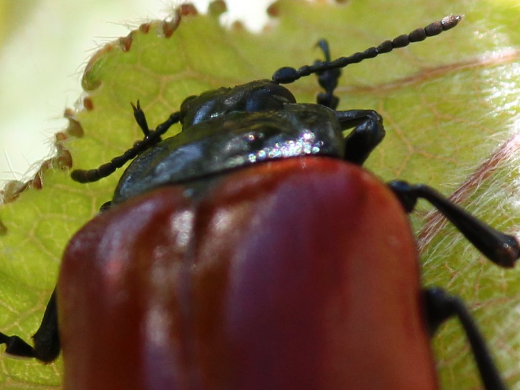 Ecco un paio di esempi tra gli scatti venuti "meglio". Stesso soggetto (Chrysomela populi), con focale 55m e 154mm, sempre con lente addizionale. la prima immagine è il fotogramma intero ridotto, la seconda un crop a dimensioni originali.