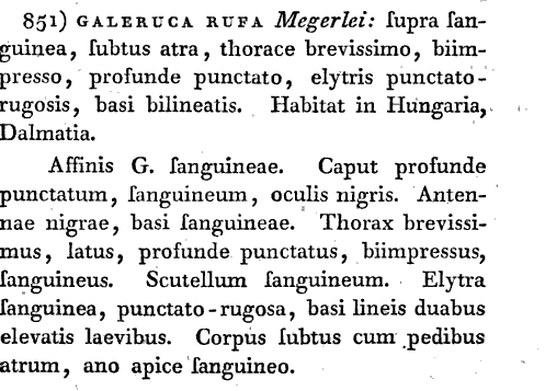si, avevo notato anch'io che nella checklist della Fauna d'Italia è fra parentesi, ma è un errore, Germar nella descrizione originale la descrive nel genere Galeruca, e questa è l'unica cosa che conta. La pagina che ho riportato è quella originale. Penso che l'errore della checklist, data la diffusione dell'opera, ne abbia generato molti altri, che l'hanno seguita.