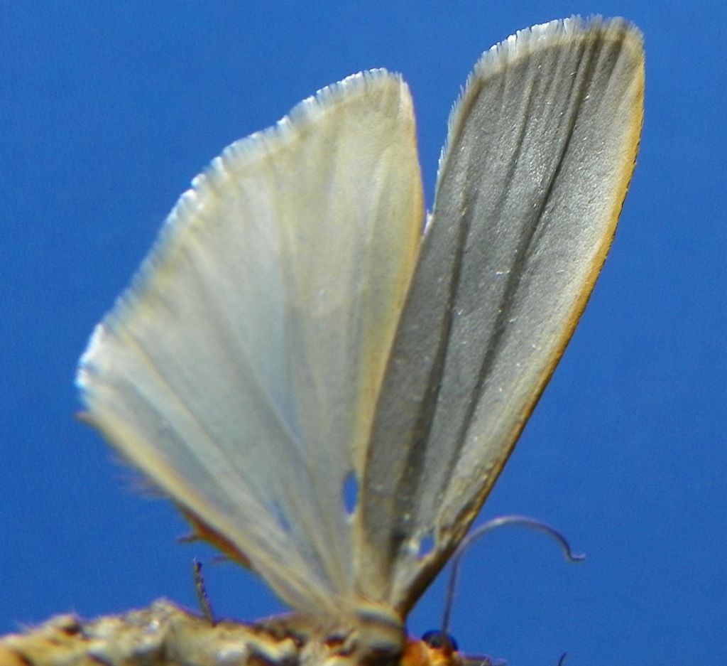 Finalmente ho potuto montare alla mia compattina 2 lente addizionale, come si evidenzia nella foto ali posteriori del maschio ( per quello che si evince dalla foto ) in oggetto manca di androconi gialli sulla nervatura in posizione centrale ,che invece si evidenziano nel campione di confronto di Eilema complana quindi possiamo con buona sicurezza aver determinato una Eilema caniola.. Hubner ((1808)1796) dalla foma piu' scura, contestualmente si allega anche foto di una E.caniola siciliana di simile livrea, una ipotesi poco attendibile poteva configurarsi per pseudocomplana che comunque e' da escludere sia per l'area di raccolta ( ma non e' regola ) ma sopratutto per gli androconi non presenti in quella zona dell'ala sudetta....Scusate ancora per qualita' foto appena sufficenti...