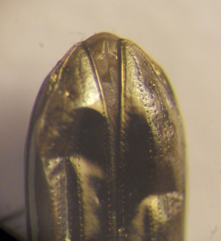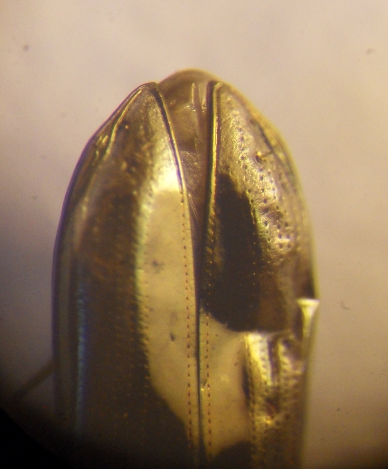 dalla foto, non riesco a vedere con certezza una cosa importante: l'apice delle elitre è metallico come il resto dell'elitra (come credo che dovrebbe essere), oppure è giallognolo non metallico?