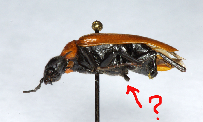 Ho fatto una nuova foto (molto schiarita per contrastare un po', altrimenti nero su nero si confonde tutto) e mi pare che si, il prosterno si allunga tra la base delle zampe anteriori.