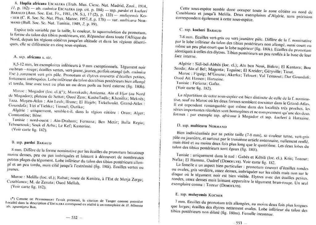 Questione complessa. Ho radunato le mie poche Hoplia nordafricane di questo gruppo ed è un ben misero materiale: - 1 ex del Rif (Marocco settentrionale), secondo me sicuramente riferibile a bilineata e praticamente uguale a quello della foto di Honza (primo a sinistra) con due ampie zone laterali del pronoto prive di squame. Grandi dimensioni (12 mm) e squamulatura elitrale che in certe zone non è embricata (il margine anteriore delle squame è interamente visibile), in altre lo è leggermente. - 2 ex di Ain Draham (NW Tunisia), inviatimi come bilineata ma secondo me da riferire a africana africana. Grandi dimensioni (11,5-13 mm), squamulatura elitrale molto fortemente embricata. - circa 40 ex dei dint. di Kenitra (costa atlantica settentrionale del Marocco). Le avevo determinate come africana pardoi. Dimensioni variabili (8,5-11,5), squamulatura simile all'esemplare oggetto di questo post (la definirei leggermente embricata?); il pronoto è coperto di squame, sebbene con delle piccole areole nude, ma alcune femmine hanno un diradamento bilaterale e possono ricordare delle bilineata atipiche. - circa 30 ex di Agdz-Oued Draa (Marocco sud-orientale), raccolti in una regione già subdesertica. Le avevo determinate con dubbio come africana kocheri. Dimensioni relativamente piccole (7,5-9 mm), squamulatura embricata (meno che in africana typ.) di colore simile ad Hoplia attilioi; zampe costantemente rossastre. Nel complesso non ci ho capito molto e, a mio parere, il testo del Baraud sugli Scarabaeoidea nordafricani non riesce a essere risolutivo. Sempre a mio parere il gruppo andrebbe revisionato con materiale numeroso di varia provenienza e con la ricerca e lo studio di nuovi caratteri diagnostici. Gianfranco, hai raccolto altri esemplari? Sono abbastanza costanti? Dimensioni?  Ciao Piero