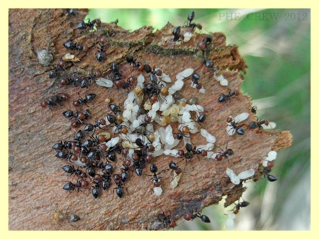 due foto che ritraggono una parte del formicaio con uova, individui adulti e giovani sotto corteccia di Eucalipto. fotografati ad Anzio (RM) il 16.IX.2012.