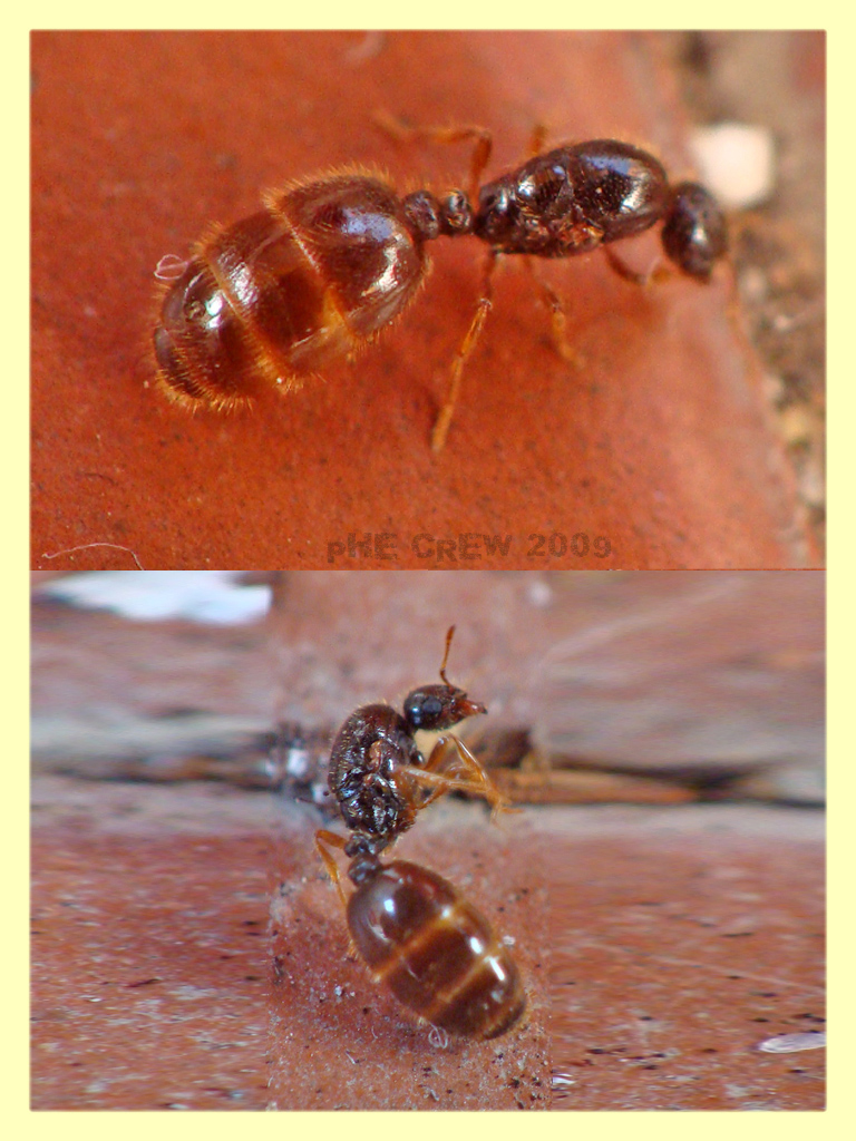non ti so dire specie e genere, pero' si tratta di regina di una specie di formiche ipogee, che vivono esclusivamente sotto terra senza mai emergere. Le operaie sono molto piccole, circa 3 mm, di colore giallino ambrato, le regine piu' scure con l'addome leggermente orangiato. Sfarfallano in massa nelle giornate di fine estate o inizio autunno, in genere dopo i temporali. E' facile vederle in sciami sopra le cime degli alberi.