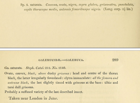 Come Galeruca saturata da Stephens nel 1831 a pagina 288 e 289 del suo "Illustrations of British Entomology; or, a synopsis of indigenous insects, containing their generic and specific distinctions; with an account of their metamorphoses, times of appearance, localities, food, and economy, as far as practicable. Mandibulata, vol. IV. London, 408 pp."