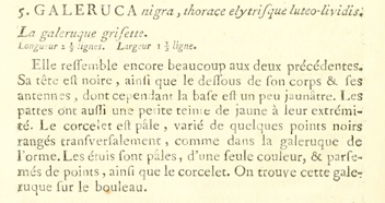 Venne descritta anche come Galeruca nigra nel 1762 da Geoffroy a pagina 254 del suo " Histoire abrege des Insectes qui se trouvent aux environ de Paris, dans laquelle ces animaux sont ranges suivant un ordre methodique. I. Paris, 523 pp."