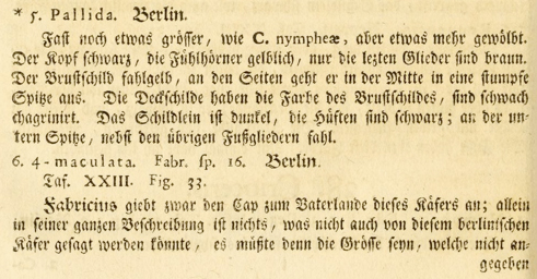 Venne poi descritta anche come Criceris pallida da Herbst nel 1783 a pagina 66 del suo" Kritisches Verzeichniss meiner Insektensammlung. In: Foessli J. C. Arch. f. Insectengesch., Zürich, 4: 1-72." che però non sono riuscito a trovare :cry: :cry: