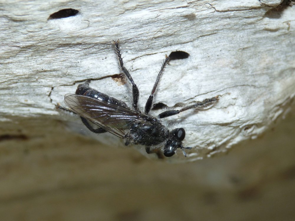 gli esemplari appartengono alla sottofamiglia Laphrinae (antenne clavate) e sembrano proprio Andrenosoma albopilosum Villeneuve, 1911 che io ho raccolto in spiaggia a Piscinas. Se li hai per sbaglio raccolti sarei felice di vederli e dire con certezza se si tratta di questa specie. Le larve vivono nei tunnel scavati da larve di xilofagi dei quali pare si nutrano.