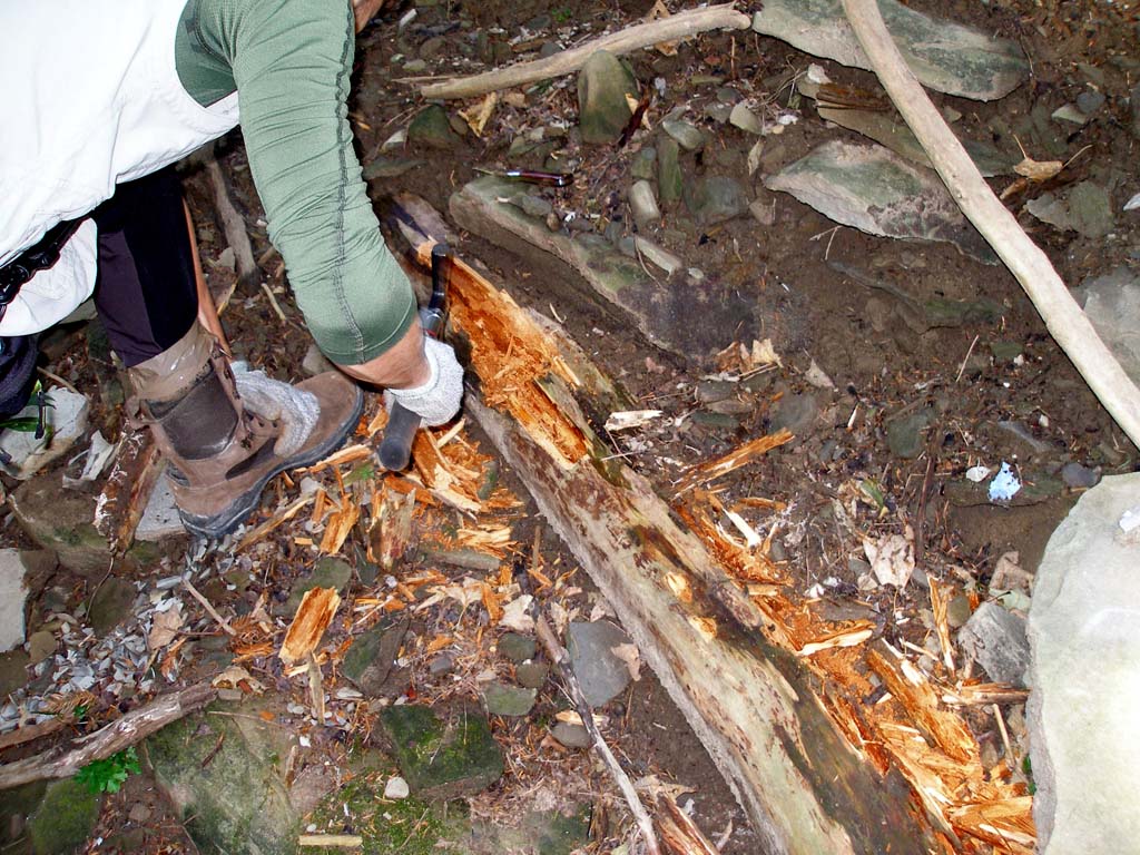 Il legno per i Propomacrus me lo sono procurato da un noce morto (ìgiovane) in piedi. Il fatto è che, dopo appena un paio di colpi di accetta, il tronchetto (diametro circa 15-20 cm), è rovinato a terra rischiando di travolgerci. Il fatto è che era evidentemente più deteriorato internamente di quanto non sembrasse; era, infatti, solcato da innumerevoli gallerie