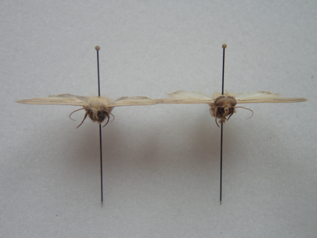 Marco... onestamente non mi sembra... confrontando le foto esposte da te, i danni sui due campioni sono diversi, nella prima foto si evince la totale mancanza di peluria, in sede di spillatura addome, nella seconda ammeno di una ricrescita miracolosa postmortis di pelo, lo spillo e' parzialmente coperto da pelo, per non parlare di tre punti neri ( se son punti neri ) ricorenti in entrambi le ali dell'ultima e un disegno screziato giallo piu carico di fondo, contrariamente la scomparsa di quelli neri sulla cellula discoidale della prima foto, e la machiettatura della frangia ali postreriori appena visibbile e ali piu' slanciate. Determinare quest'ultimo esemplare diventa arduo in quelle condizioni, a me non mi sembra neanche una mytimna forse un anfiphyrina ....DIAVOLO NON PER CRITICA, ma cosa usi per stendere queste povere bestie .... tenaglie, pinze o direttamente la motosega..? ...io ho sviluppato una personale e raffinata tecnica tanto che pinzette, stenditoi, e listelli me li costruisco personalmente, preparando esemplari quasi immacolati ...ma un tantino di delicatezza nel tuo caso risulterebbe utile ...