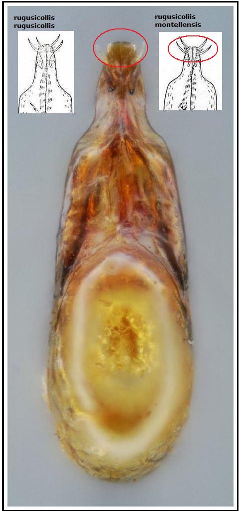 Anche io propenderei per il rugosicollis montellensis (per quello che vale :oops: ), soprattutto perché nel disegno si intuisce una leggera "allargatura" poco prima dell'apice dell'edeago, molto più evidente nella foto dove si nota anche la forte strozzatura....le leggere differenze presumo possano essere giustificate da un minimo variabilità e dai "limiti" che può avere un disegno.