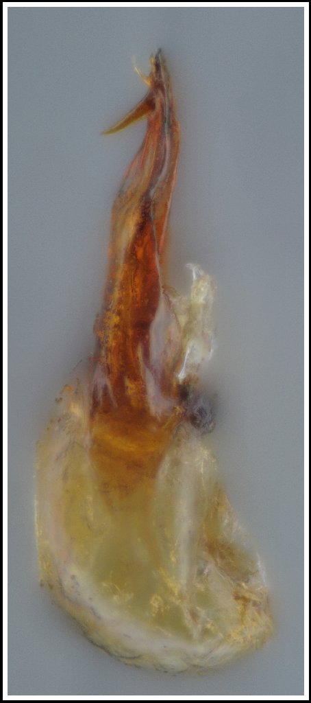 Inserisco la foto dell'edeago: un particolare volevo far notare e cioè che il "collo" prima dell'apice si restringe abbastanza vistosamente cosa che non noto invece dai disegni... :roll: :? :roll: