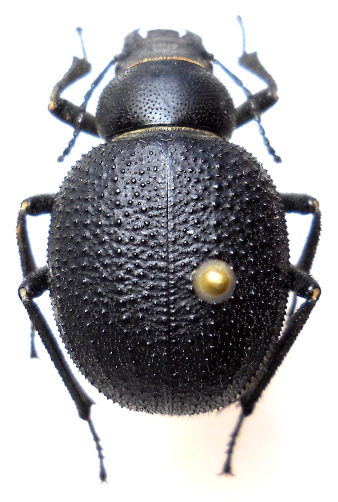 Notare la scultura delle elitre, prive di carene e con tubercoli lucidi di diverse dimensioni